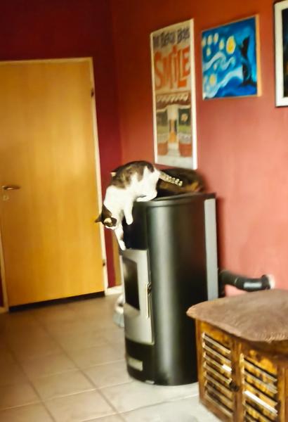 Minou und Ivy lagen gerade wieder zusammen auf dem (in dem Moment ausgeschalteten) Ofen. Als ich mein Handy holte und ein Foto machen wollte, sprang Ivy herunter :boese: