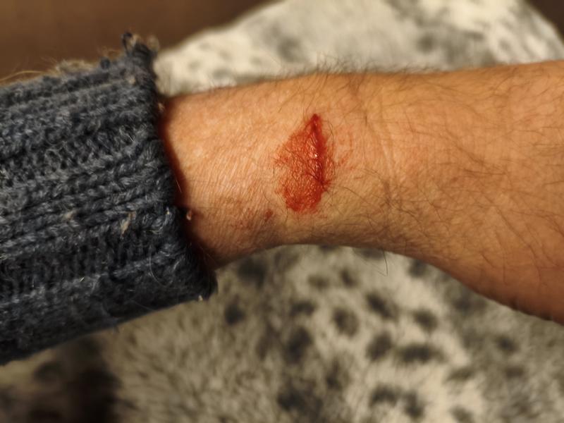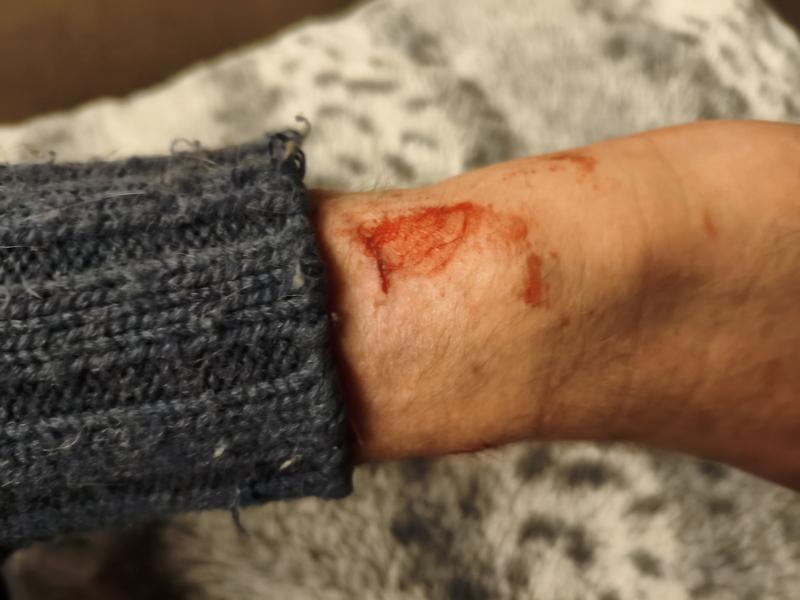 Als ich sie endlich hatte und in die Box setzen konnte, zappelte sie so wild, dass ich mir ein paar Kratzer am Handgelenk zuzog. Als ich gerade wiederkam, bemerkte ich außerdem, dass sie in ein Katzenbett, auf dem sie vor mir geflüchtet war, Pipi gemacht hatte.